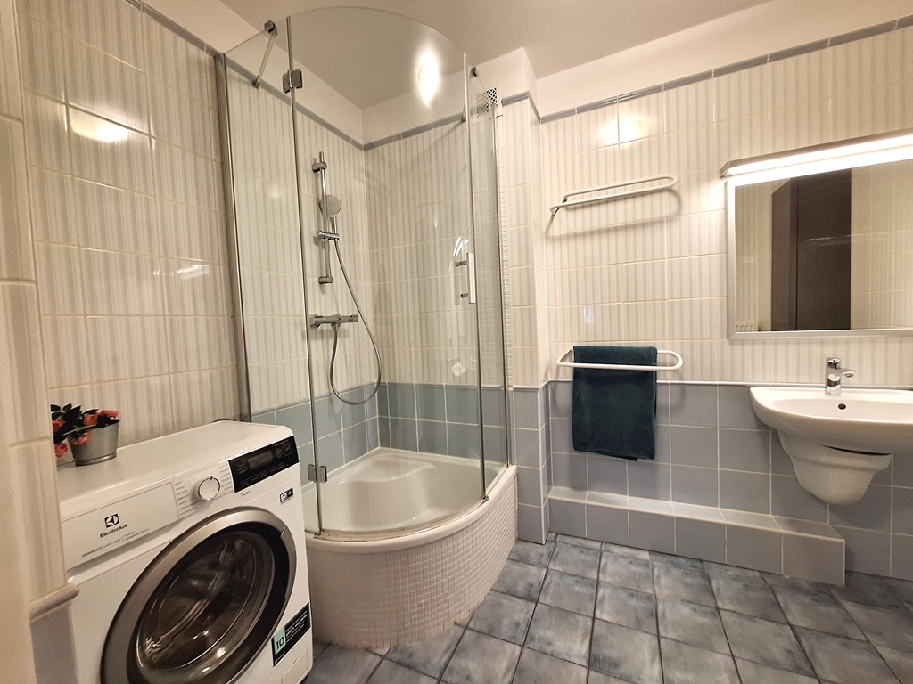 Łazienka z kabiną prysznicową, jest pralka. Oddzielnie toaleta z umywalką.